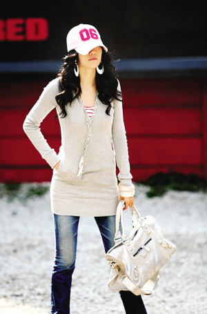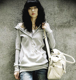 连帽卫衣几乎深入时尚达人们的生活,那种舒适自在的态度是它最迷人的地方。天气热起来卫衣是穿不住了,但是你可以选连帽的T恤。这款灰色的连帽T恤不仅类似卫衣的味道,有一点玩世不恭,而且香肩无意中的一露还特别性感,如果肩膀和锁骨挺美的不妨秀出来。