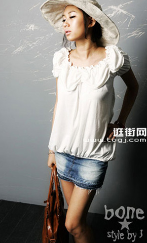 泡泡袖小T恤搭配牛仔裙十分的可爱,宽边太阳帽不但可以遮阳还是很好的搭配饰品。