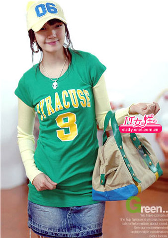 绿色长衫与浅黄色搭配十分活泼,字母图案是运动MM必选的上衣单品之一。