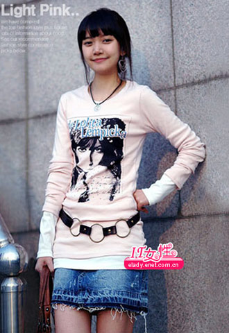 粉色长衫因为朋克图案而酷了很多,金属的大腰带装饰也与牛仔的硬朗感觉很和谐。