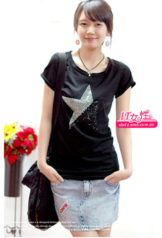 浅色的牛仔与黑色的T恤搭配简约又有个性,别致的星星图案是引人入胜的焦点。