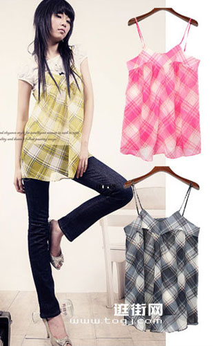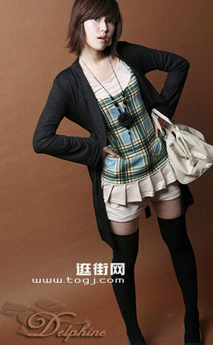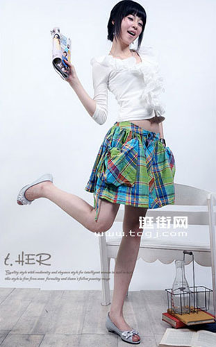格纹衫与素色短裙搭配简繁有致,重点突出