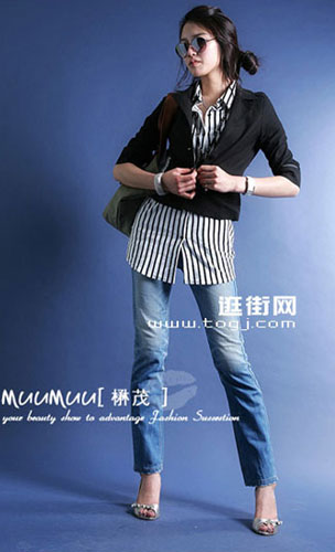 竖条纹衬衫突出干练沉稳的OL风范,牛仔裤融进休闲味