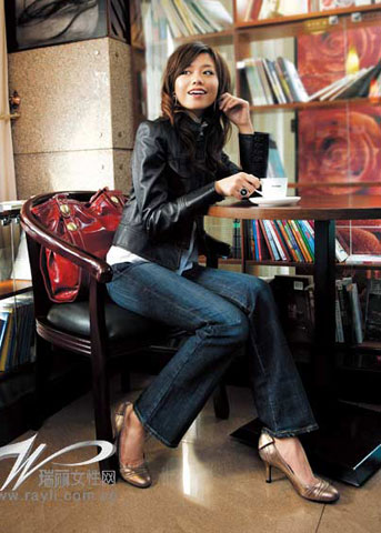 黑色皮夹克搭配窄腿牛仔裤帅气又有型,用修身的窄腿牛仔裤搭配皮夹克,用金色高跟鞋强调时髦亮点。