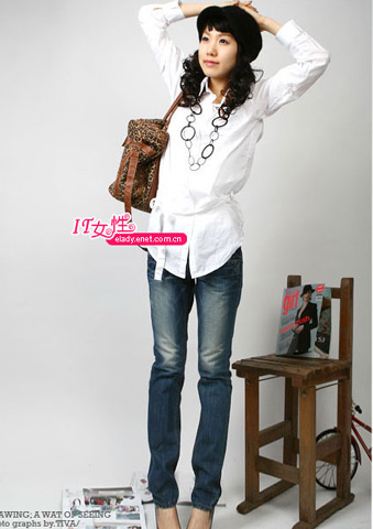 白色衬衫配牛仔裤工作休闲都能穿,夸张的项链和包包留住众多目光。