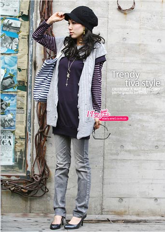 条纹的运动活跃素雅的色彩,长衫的混搭配锥型裤酷中又带着点可爱。