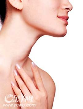 颈部保养不好,更容易出卖自己的年龄。涂颈霜前最好用温热的毛巾先暖敷2分钟,涂抹的时候要稍稍扬起头,用双手的拇指和食指轻轻地向上交替推按。在已经形成颈纹的地方稍作停留,将手轻按在上面几秒钟。最后用双手的食指和中指放于下颌骨下淋巴节处停留按压1分钟,促进淋巴循环。此外,颈部更容易堆积死皮,每个星期都应该做一次温和去死皮的面膜。在日间如穿着露脖子的衣服,也应该注意使用具有防晒功效的护肤品。