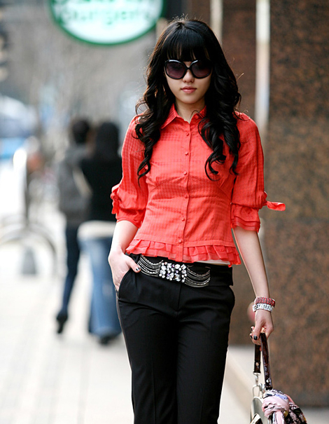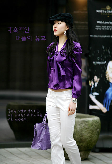 紫色的衬衫也是不错的选择,优雅的感觉属于这个色彩,而且亮缎面更增添了几分贵气,年轻一些的OL最好搭配普通布料的长裤或者一步裙来穿,这样就不会显得过于老气。