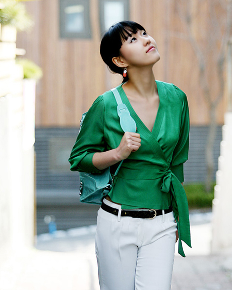 绿色的衬衫给人感觉很清新,好像和服一样的系带开襟设计非常有新意。