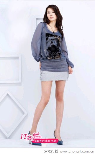 深灰透视上衣尽显成熟的诱惑,搭配浅灰短裙美腿动人。整体的灰色调打造酷女郎。