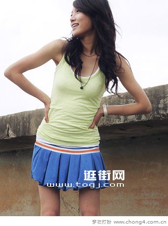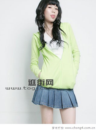 苹果绿帽衫搭配超短牛仔裙活力四射
