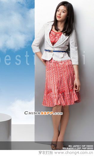 可爱的红色印花裙外搭一件白色荷叶领小西装,把度假的舒适感觉带进压抑的办公室。