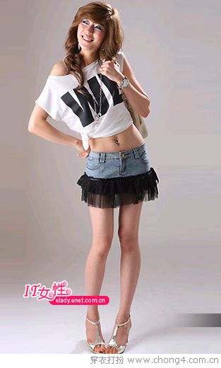 大大的WE宣告你们的亲密,露脐装扮展现窈窕腰线,黑纱镶边的超短牛仔裙让你的美腿尽情释放魅力。