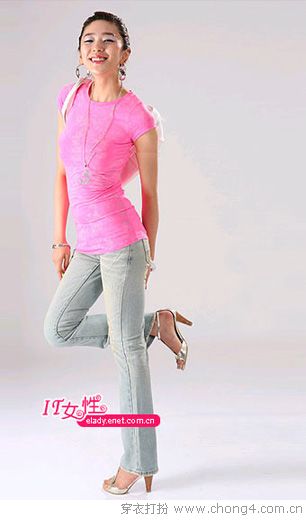 紧身桃红色T恤搭配淡色牛仔裤,性感S型就那么轻松打造出来了。