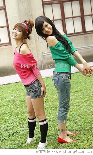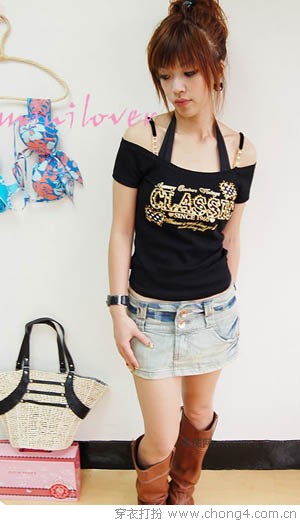 颜色鲜艳的露肩T恤+超短裤/七分裤