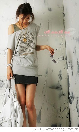 MINI SKIRT+斜肩设计T恤+加长金属项链适合听场hard rock
