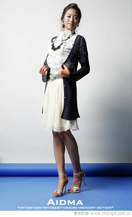 5 全身的白色组合,用深蓝色开衫收敛膨胀感