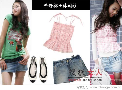 吊带衫+牛仔短裙适合充满灵动的青春女孩,牛仔单品总是在细节处理上玩花样,和新鲜的潮流密不可分,带给人不尽的惊喜