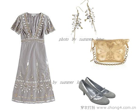 04 蕾丝边的精美设计和极具艺术美感的绣花让这条长裙品味不凡,灰白色的耳饰和镶有银边的灰色公主鞋,立刻上演现代版灰姑娘的故事,为避免色彩的单调和重复,米黄色的包包更提升了整体的质感。