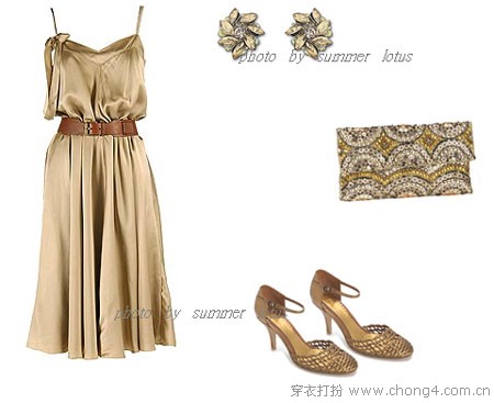 06 这样一款吊带丝绸礼服,可以说是将金色的奢华发挥到了极致,同色系的鞋子和饰品更是烘托了高贵的奢华气质,手袋和耳饰的闪钻将所有的光采都尽揽怀中。