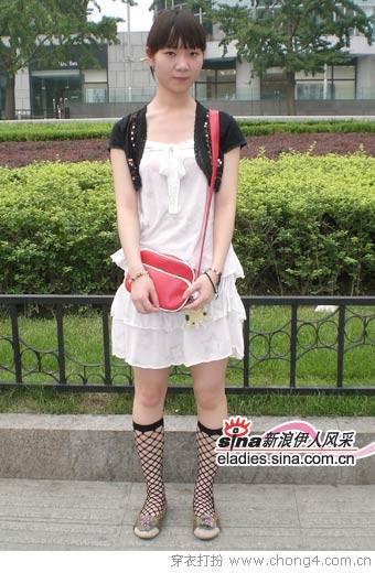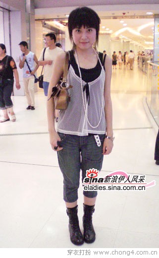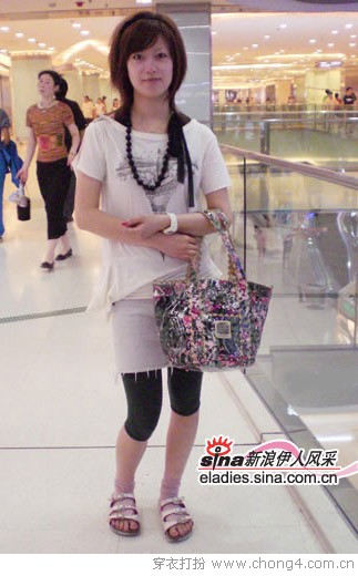11 白色涂鸦画T恤搭配直筒浅色牛仔短裙,穿上黑色紧身裤才够个性,MM力荐从香港买回的GARCIA新品包包,低调的碎花很抢眼,袜子也很特别,夹脚趾而且无后跟,这位在日本留学的MM搭配很到位,正点。